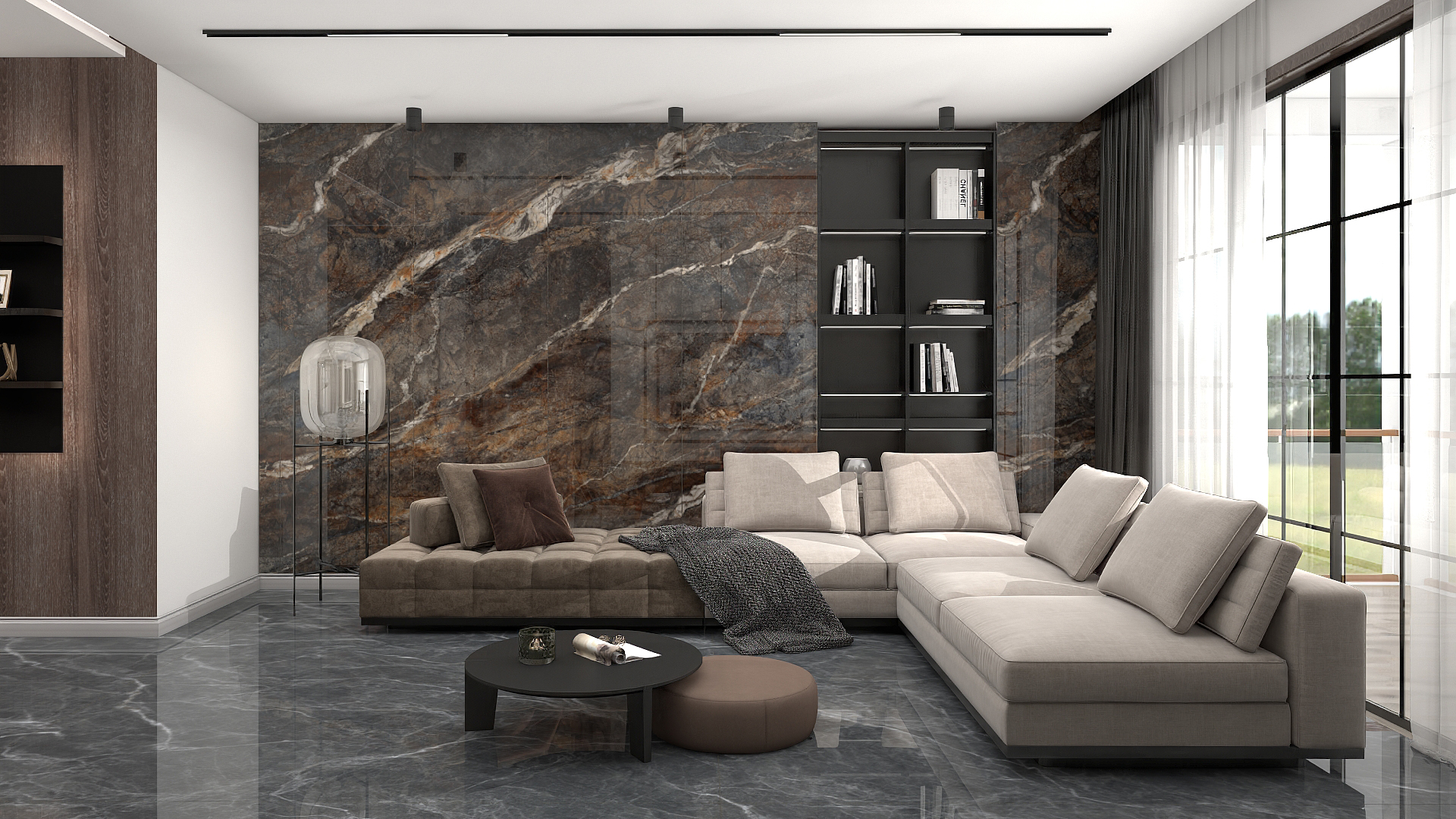 如梦幻般的午夜之光岩板与简单灰色沙发成强烈对比,再以落地窗搭配,如同在平静的空间里加入自然活力,令整个空间鲜活起来!