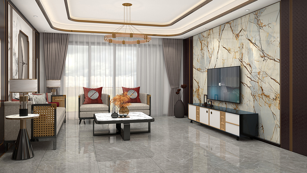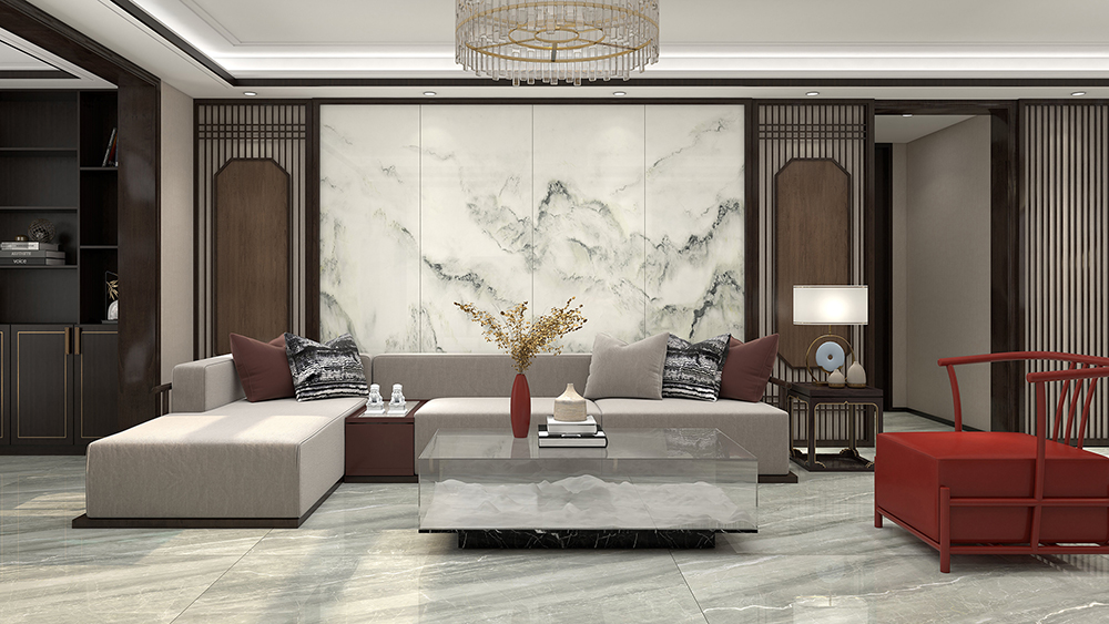 深邃而不凡的玉麒麟岩板,带来大自然的大气时尚,搭配新中式家具,中灰地面,简约的吊顶,让客厅轻奢感倍增。