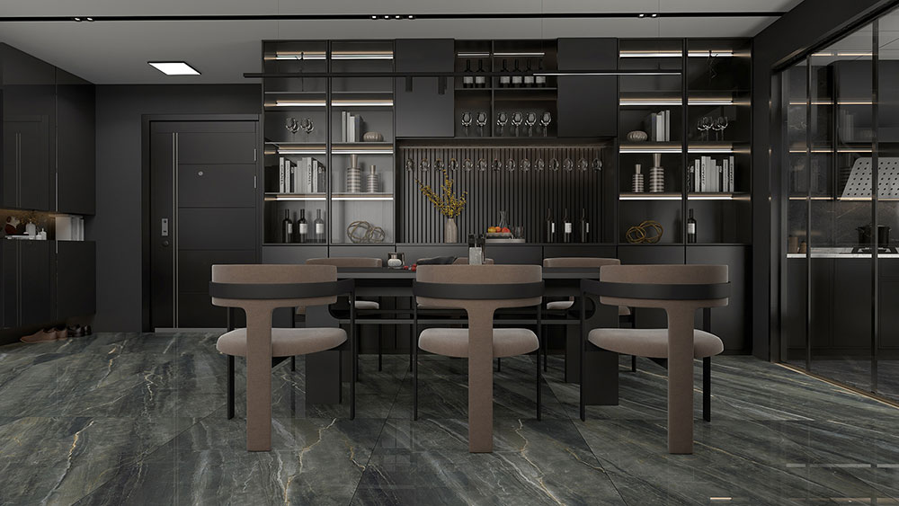 这个餐厅以云丝深灰大板为基调,从一套现代简约风的餐桌椅到一个高级优雅的酒柜,深灰色调让空间安静且极具品质感。