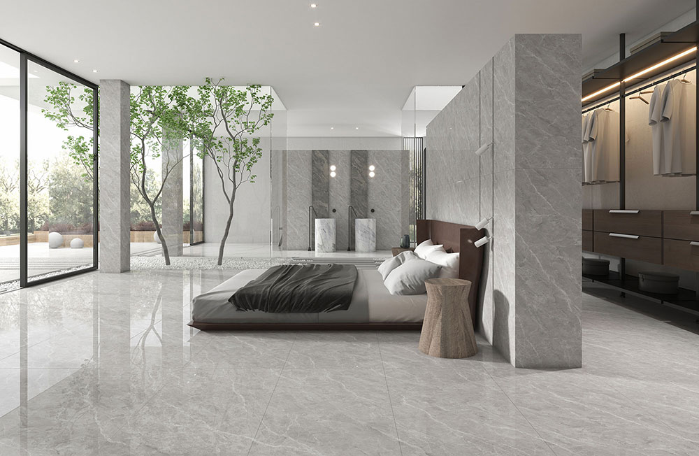 德赫尼灰岩板,带着沉淀的优雅气质,在超大空间使用时,只需要和宁静的白色结合,就能够让空间的配色显得简单又纯粹,精致又高级。