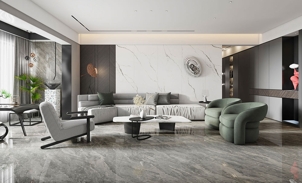 多拉灰岩板与黑白灰的整体风格设计,重新演绎了极简与时尚。豆绿色沙发作为点缀,带来沁人心脾的感觉,大气优雅的多拉灰岩板,为空间注入满满的时尚感。