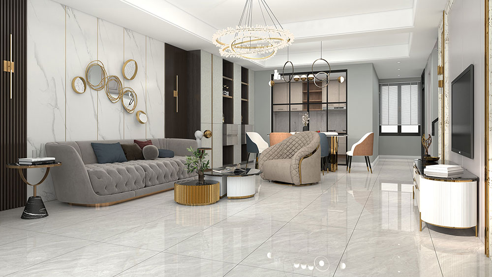 此空间铺贴格兰德灰岩板,融入现代极简家具,延续现代简约风格,满满的高级感,层次丰富,干净利落,时尚又不失品位。