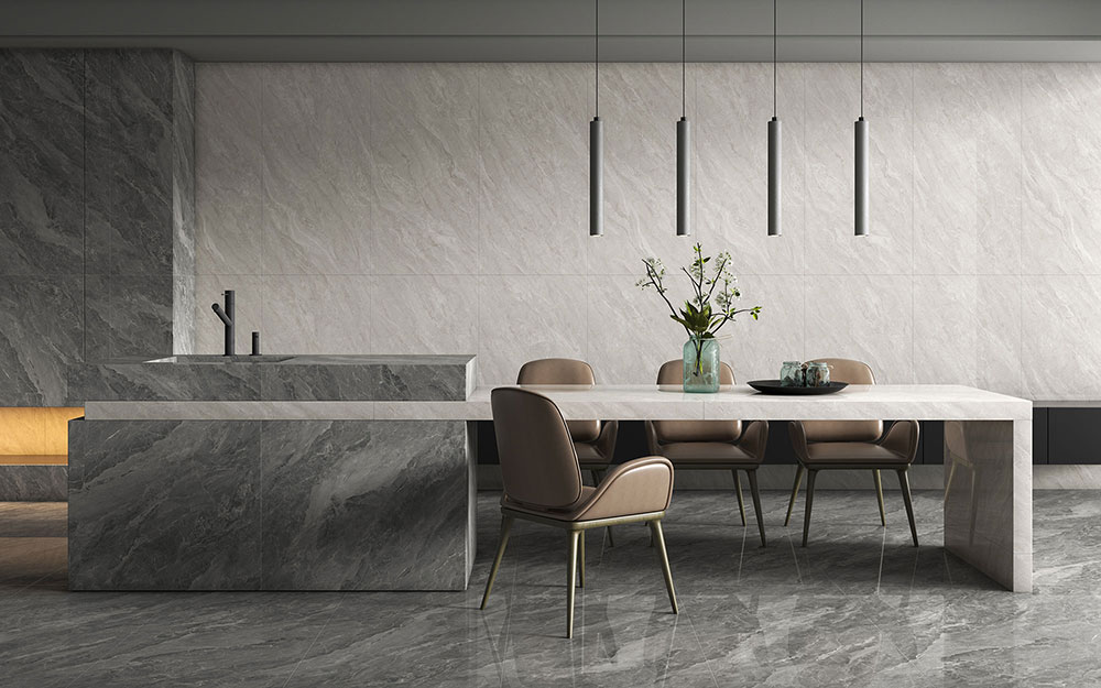 放眼餐厅空间,皆是格兰德灰岩板与阳光互动散发出来的温柔,随着纹理的漫射,空间里每一处都充满优雅的气息。格兰德灰的成熟与雅致,凸显了空间的低调时尚质感。