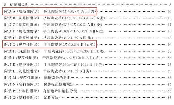 国标附录A和附录G规范两种不同压制类型陶瓷砖,国标附录A针对挤压成型陶瓷砖(劈开砖、马路砖等)的各种参数,国标附录G针对干压成型陶瓷砖的各种参数。